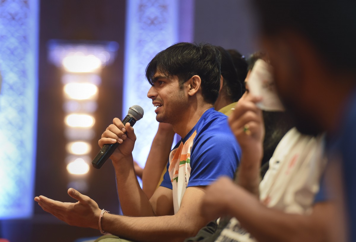 Neeraj Chopra, who won gold medal in the javelin throw event of the recently concluded Tokyo Olympics 2020, speaks during a press conference in New Delhi, Tuesday, Aug 10, 2021. Photo: PTI/Atul Yadav