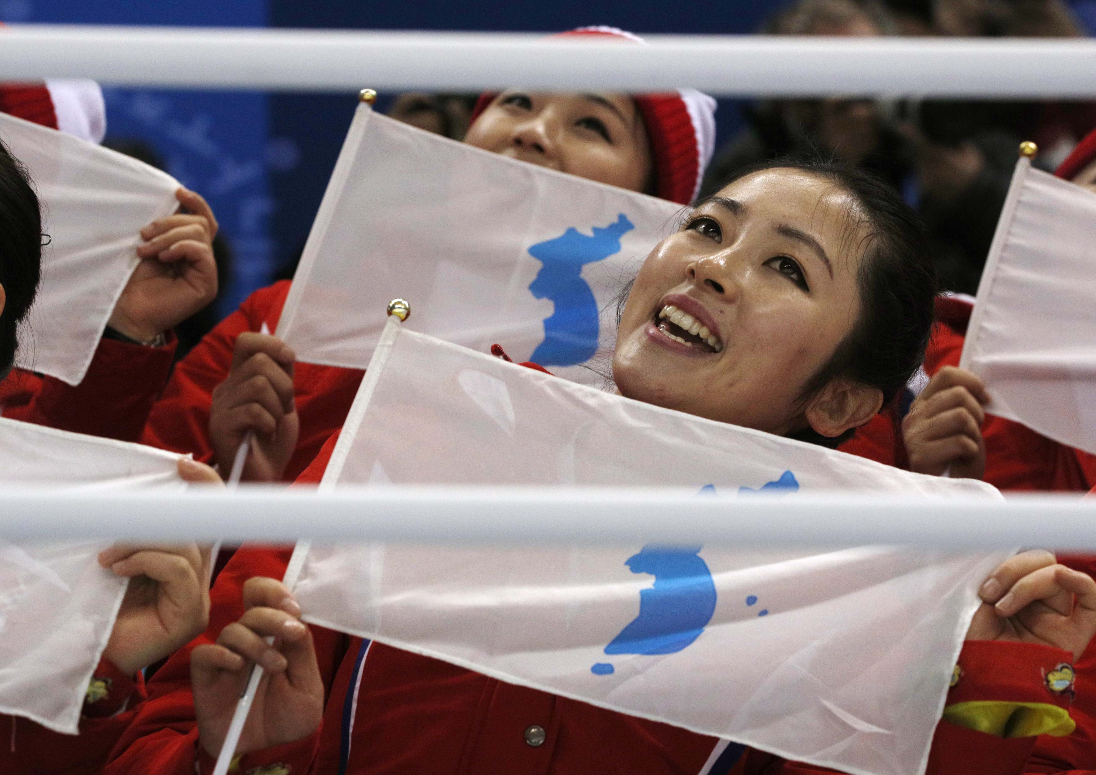 North Korea's cheer squad holds the unification flag. February 10, 2018. Credit: Reuters/Brian Snyder/Files