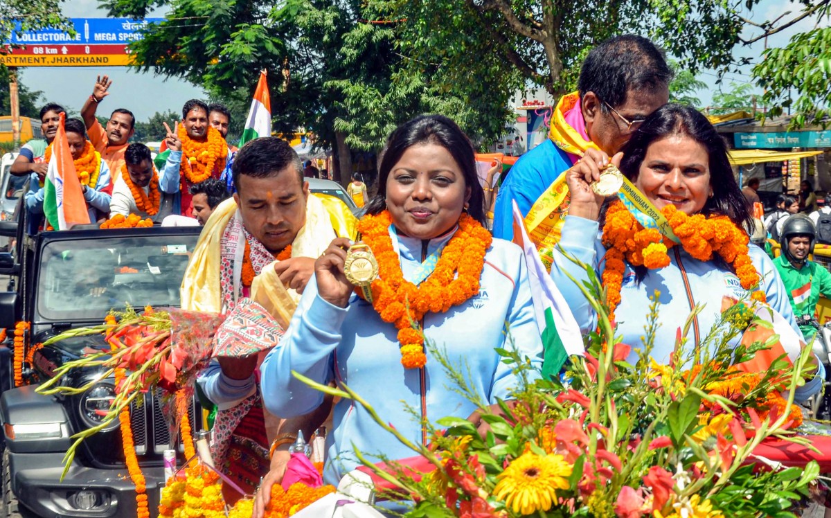 Commonwealth Games 2022 Gold medalist lawn bowl players Rupa Rani Tirkey and Lovely Choubey being welcomed upon their arrival at Birsa Munda International Airport, in Ranchi, Tuesday, Aug. 16, 2022. Photo: PTI