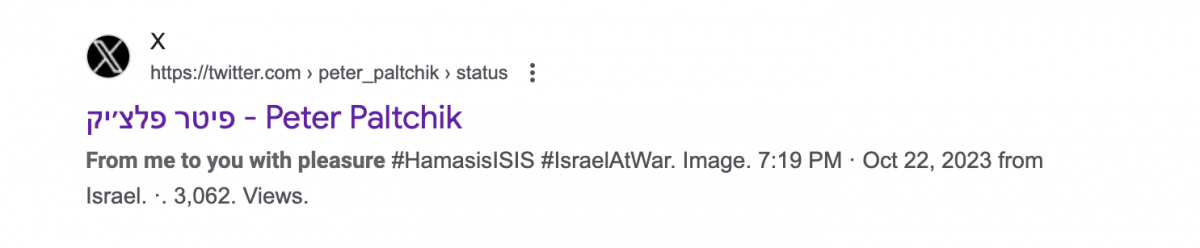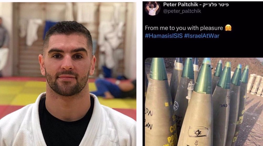 On October 22, 2023, Paltchik tweeted a photo of Israeli bombs with the message, "From me to you with pleasure #HamasisISIS #IsraelAtWar". The bombs bear what appears to be his signature, as well as the word 'ippon' – a term from judo whose significance is explained below.