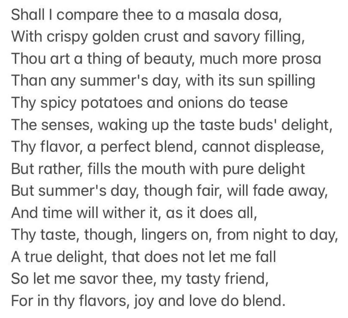 I prompted AI to write a Shakespearean sonnet imitating Sonnet 18 ‘Shall I Compare Thee to a Summer’s Day?’ and suggested the title ‘Shall I Compare Thee to a Masala Dosa?'