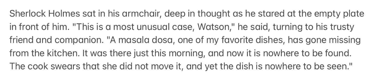 Then it came up with the opening paragraph of a Sherlock Holmes mystery titled ‘The Case of the Missing Masala Dosa’.