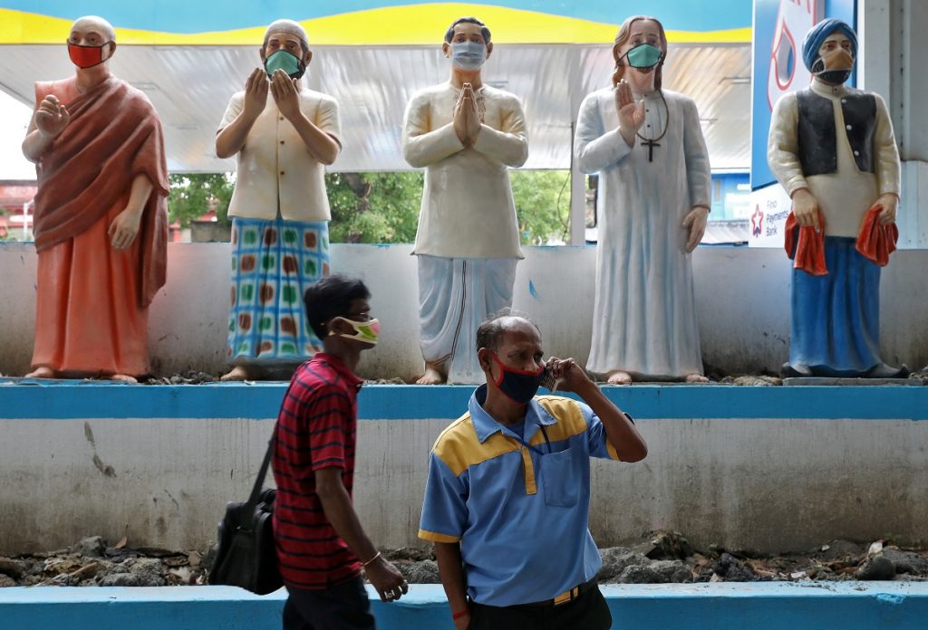 Men wearing protective masks move past figures with face masks installed outside a fuel station in Kolkata, May 1, 2020. Photo: REUTERS/Rupak De Chowdhuri