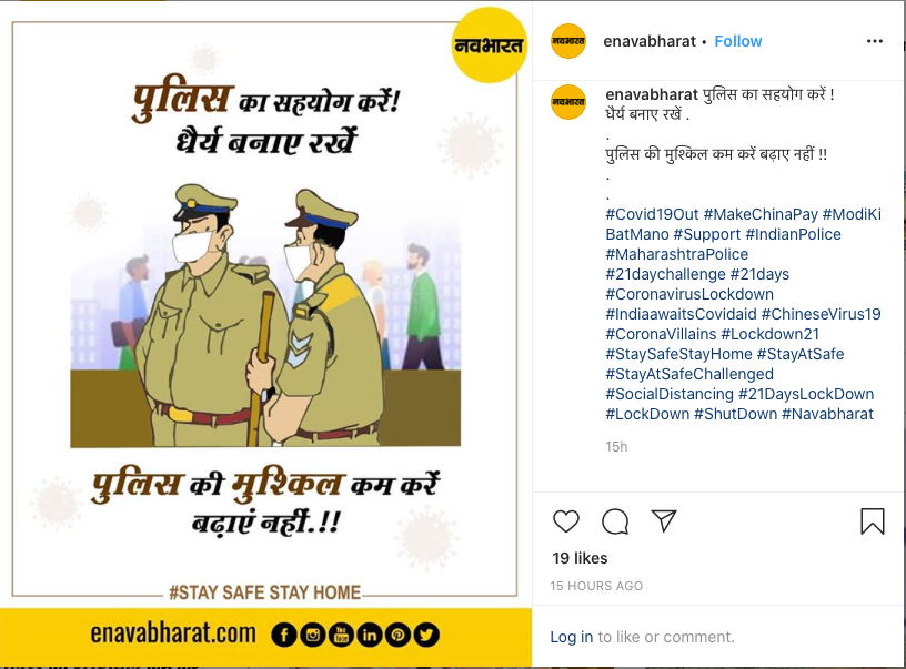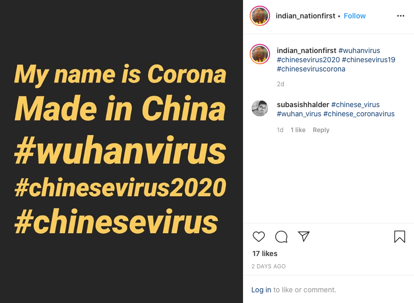 This was also not limited to Twitter. Instagram witnessed sporadic activity as well. In some instances, #chinesevirus19 was accompanied by hashtags like #MakeChinaPay ,#ModiKiBatMano, #Support, #IndianPolice, #incredibleindia, #wuhanvirus and #chinesevirus etc.