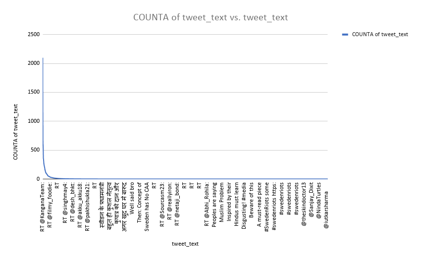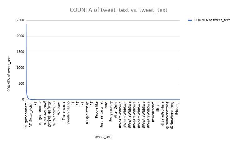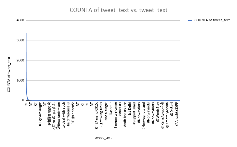 Just as it was for SwedenRiots, in this instance too, a plot of unique tweets vis-à-vis their occurrence indicated a heavy-top and a long-tail. The top 1% of tweets accounted for nearly 66% of the activity.
