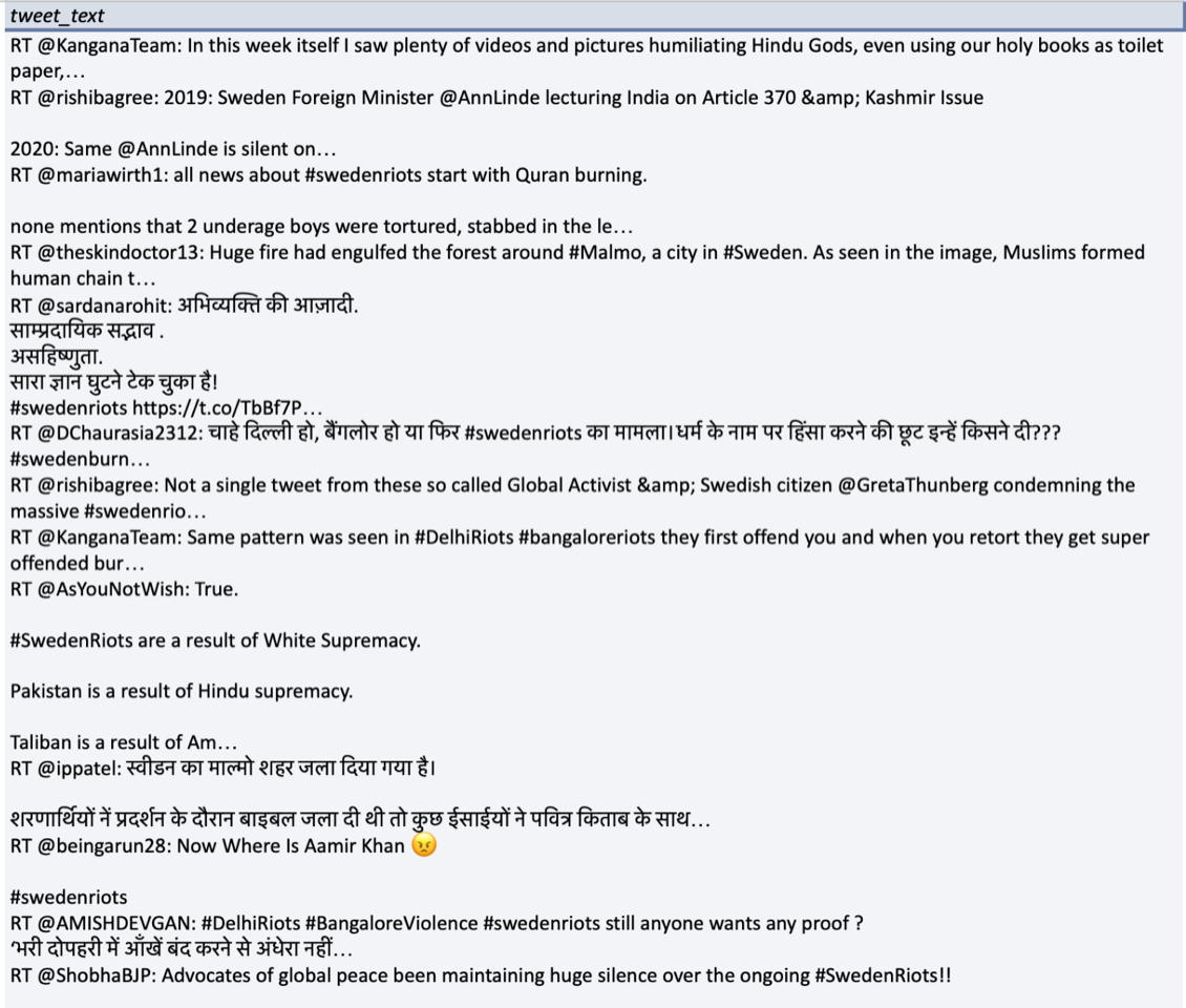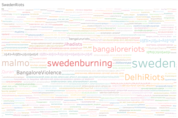 The combination of these clouds along with the most retweeted posts showed that much of the conversation was about linking the Sweden riots to recent violence in Bengaluru, the Delhi riots in February and the anti-CAA and anti-NRC protests across the country over the last eight months. One prominent narrative thread, even if not explicitly stated, was that this was the outcome of accepting Muslim refugees.