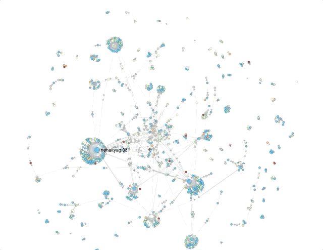 The size of the circles and density of clusters around it represent the amount of engagement (retweets, mentions, quote) an account receives.