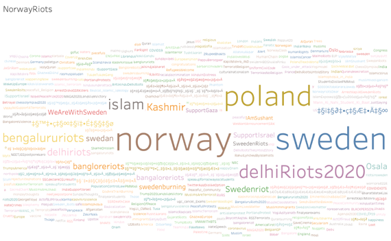 A hashtag cloud of #NorwayRiots. Note: Size of the word denotes frequency of usage.