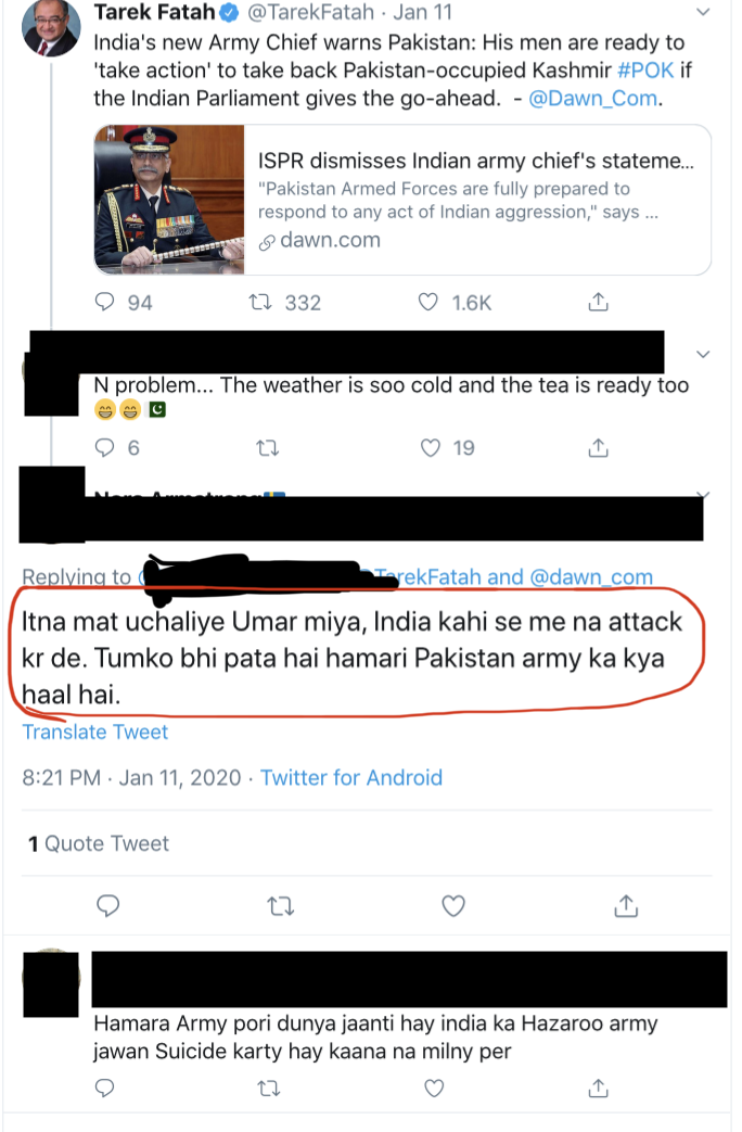 This account, created in August 2019, does not seem to have any tweets published till early January. However, one of its first few available tweets appears to use Hindi/Urdu in Roman script (the second screenshot below). The sentence composition style also appears to be South Asian rather than Northern European. This assessment, however, is admittedly subjective and does not confirm or discredit the account's authenticity.