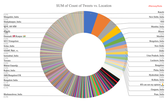 In the doughnut charts below – which plot the number of tweets by location for the remaining accounts – the predominance of Indian locations is visible.