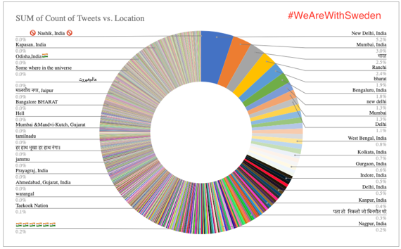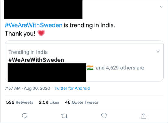 Rather curiously, there was an account which purportedly belongs to a caucasian Swedish citizen that was thankful for the fact that #WeAreWithSweden was trending in India which got a significant amount of engagement in terms of retweets and likes.