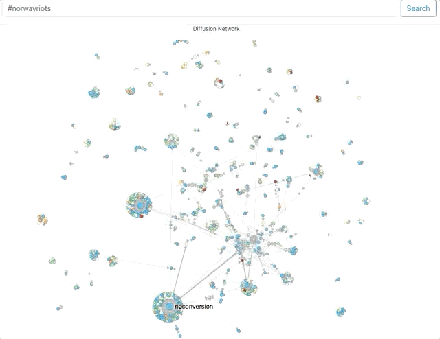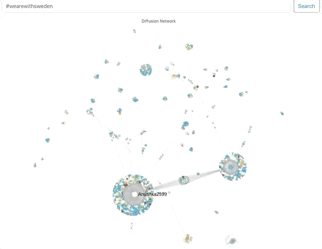 First, using Hoaxy, I attempted to get a sense of network clusters for these hashtags. Now, Hoaxy samples tweets, so its results should be considered indicative.