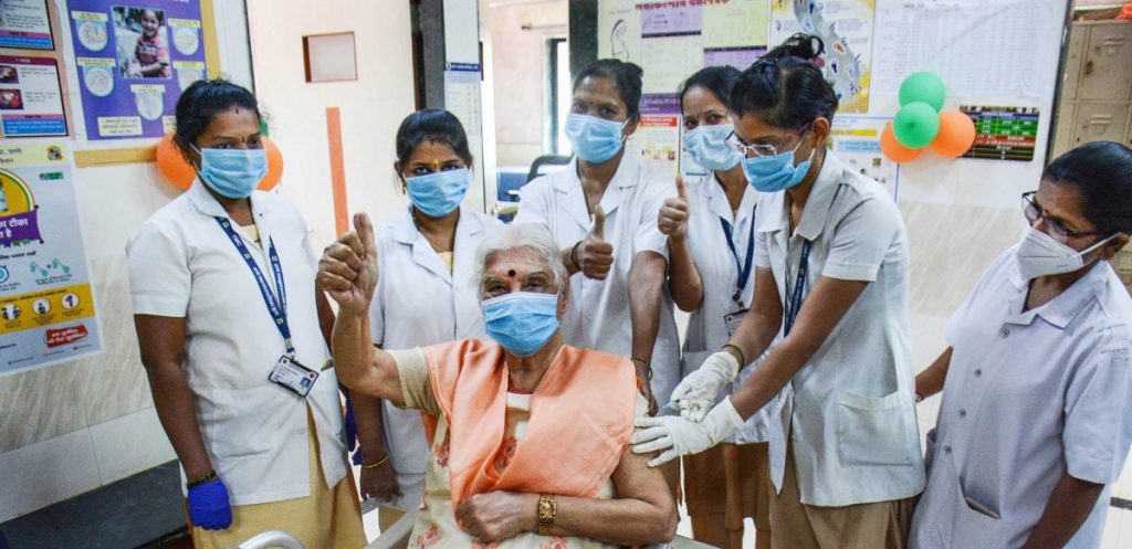 An elderly woman gets vaccinated against COVID-19 in Thane, March 2, 2021. Photo: PTI