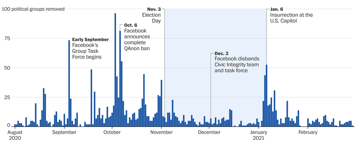 Note: Political Facebook groups were identified out of a sample of roughly 100,000. Removal dates for each group are estimates. Only groups with 10 or more posts are shown. Source: A ProPublica-Washington Post analysis of public Facebook group data collected by CounterAction. Credit:Chris Alcantara and Kate Rabinowitz/The Washington Post