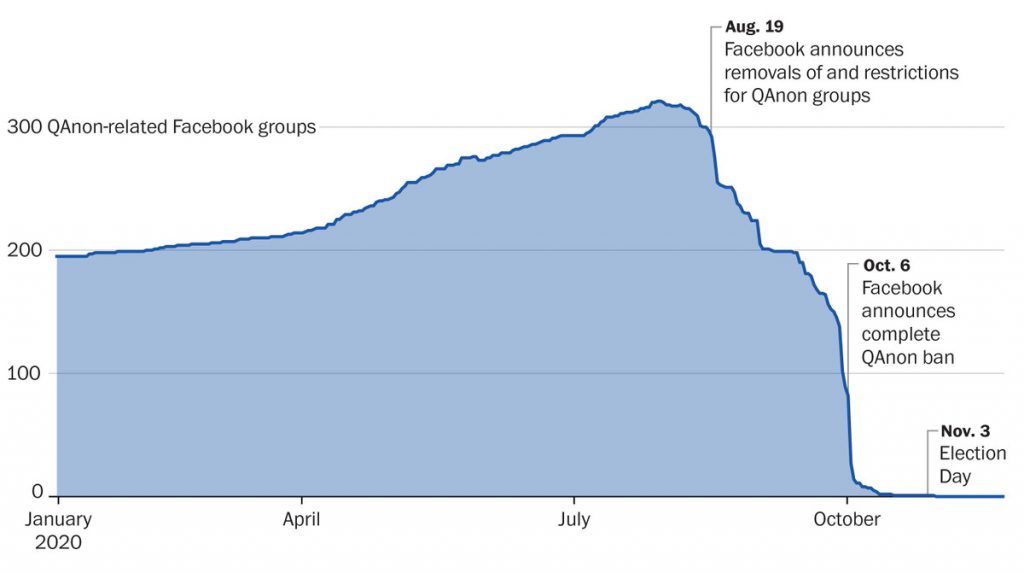 At the same time, Facebook’s Dangerous Individuals and Organizations team was identifying and removing QAnon groups ahead of the election. The results of the two teams’ actions were striking. All of the more than 300 QAnon groups identified by ProPublica and the Post had been removed by October 2020, when Facebook announced a total ban on the movement, the analysis found.