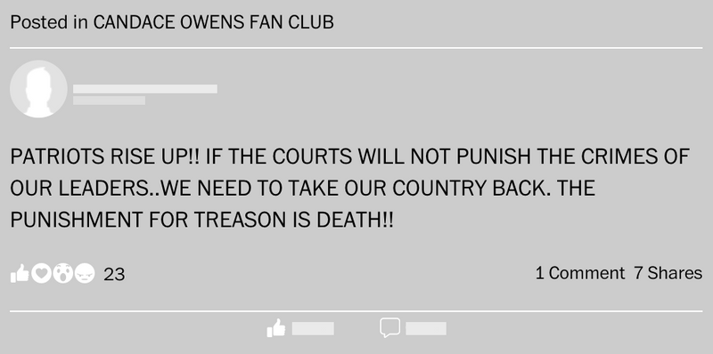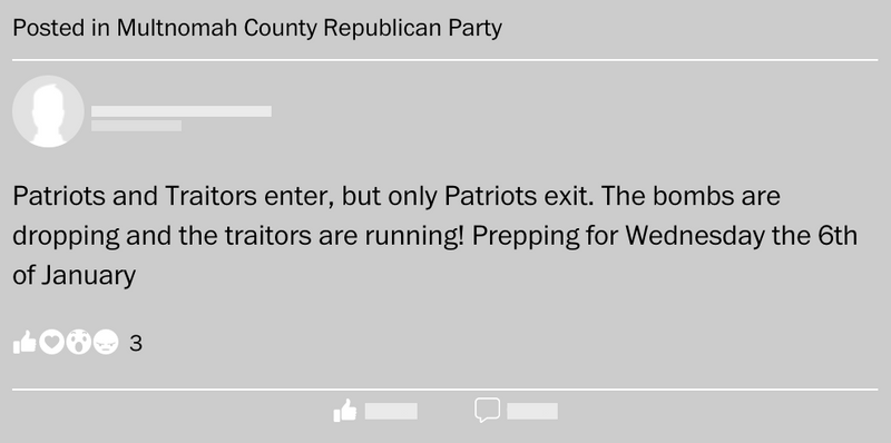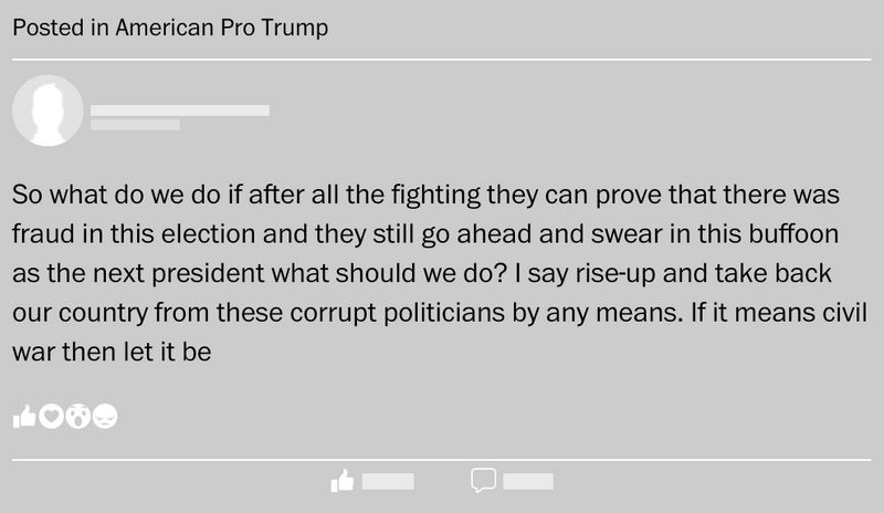 Another post, made 10 days after the election, bore the avatar of a smiling woman with her arms raised in apparent triumph and read, “WE ARE AMERICANS!!! WE FOUGHT AND DIED TO START OUR COUNTRY! WE ARE GOING TO FIGHT...FIGHT LIKE HELL. WE WILL SAVE HER❤ THEN WERE GOING TO SHOOT THE TRAITORS!!!!!!!!!!!”