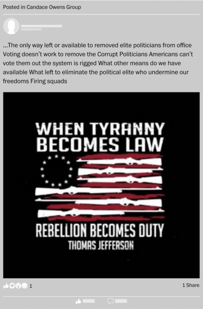 One meme featured a photo of former Representative Trey Gowdy, R-S.C., who rose to fame in right-wing circles by leading a congressional committee’s investigation into the deadly 2012 attack on the American diplomatic compound in Benghazi, Libya, accompanied by the text “If you are ok with rigging an election to win, I am ok with martial law to stop you…” That was posted in groups at least 97 times, garnering over 3,500 total likes. Gowdy has denied saying the phrase.