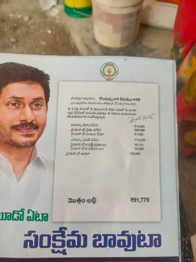 A pamphlet to a particular direct benefit transfer receiver from Jagan with details of how much money he got from the government.