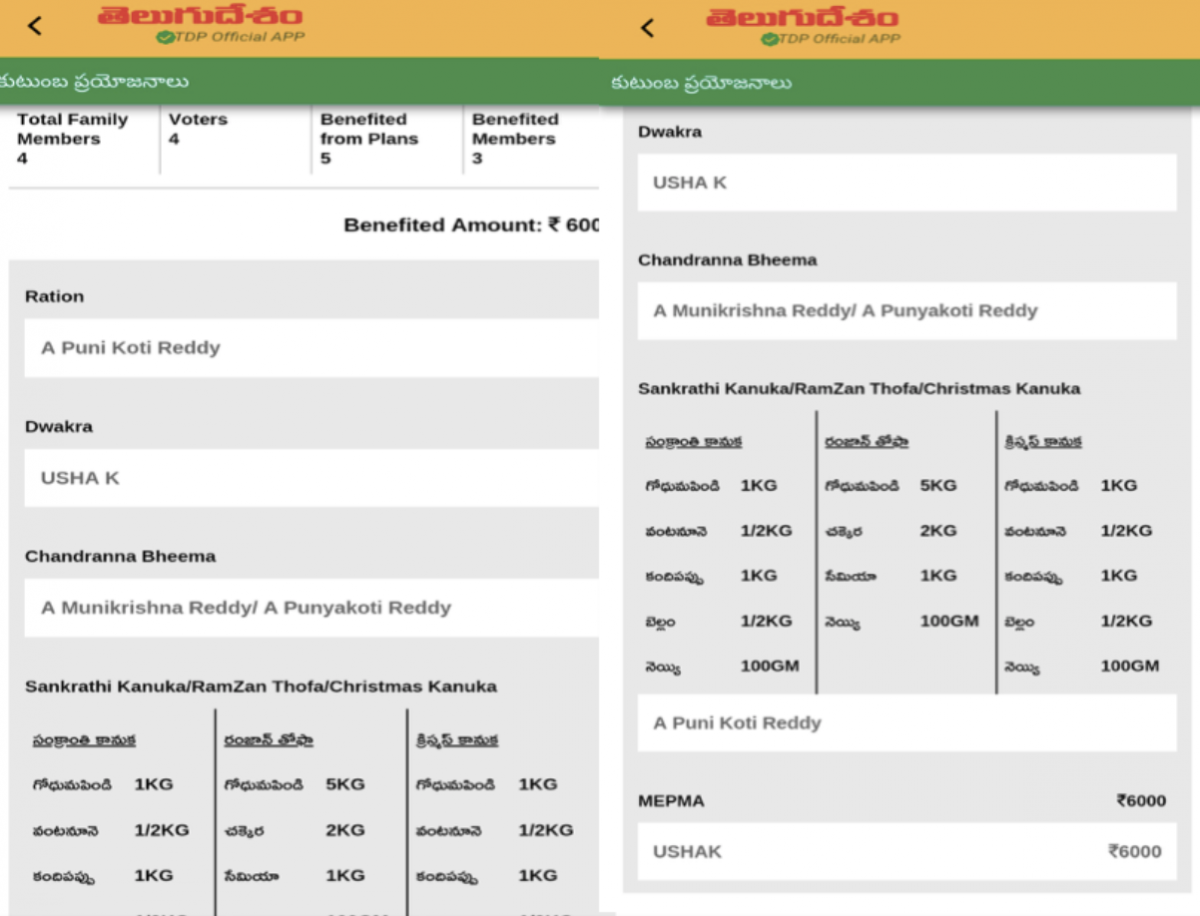 Workers of TDP were found with an android application with colour photographs of people and all details of the direct benefit transfers they had received from the government. The now ruling YSRCP opposed this development heavily and even filed a complaint with the Election Commission of India, for violation of resident privacy and usage of this information for electioneering.