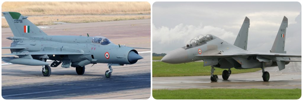 A Mikoyan-Gurevich MiG-21 and a Sukhoi Su-30MKI operated by the IAF. L: Wikimedia Commons/Jyotirmoy895, CC BY-SA 4.0. R: Wikimedia Commons/Mike Freer, GFDL 1.2.