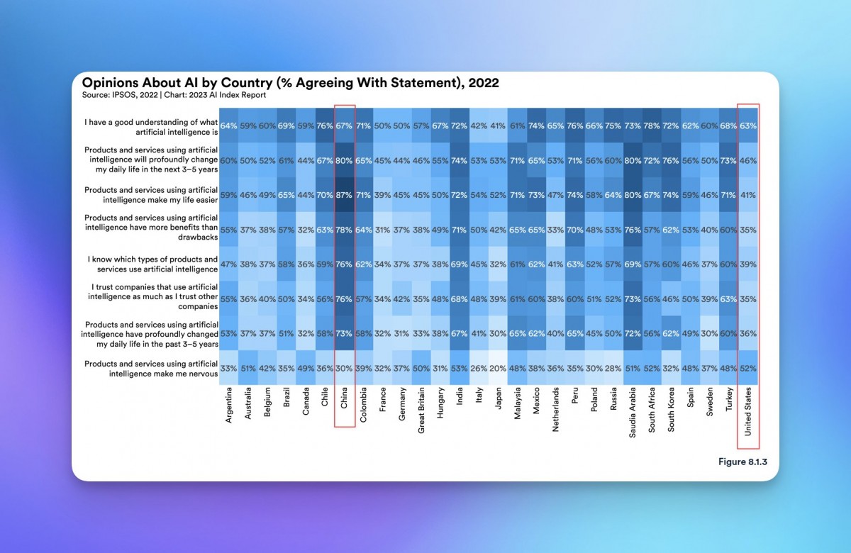The report observes that Chinese respondents seem to feel among the most positive about AI products and services: 87% of Chinese respondents claim that AI products and services make their lives easier, 76% report trusting companies that use AI as much as other companies, and only 30% say that AI products and services using AI make them nervous.