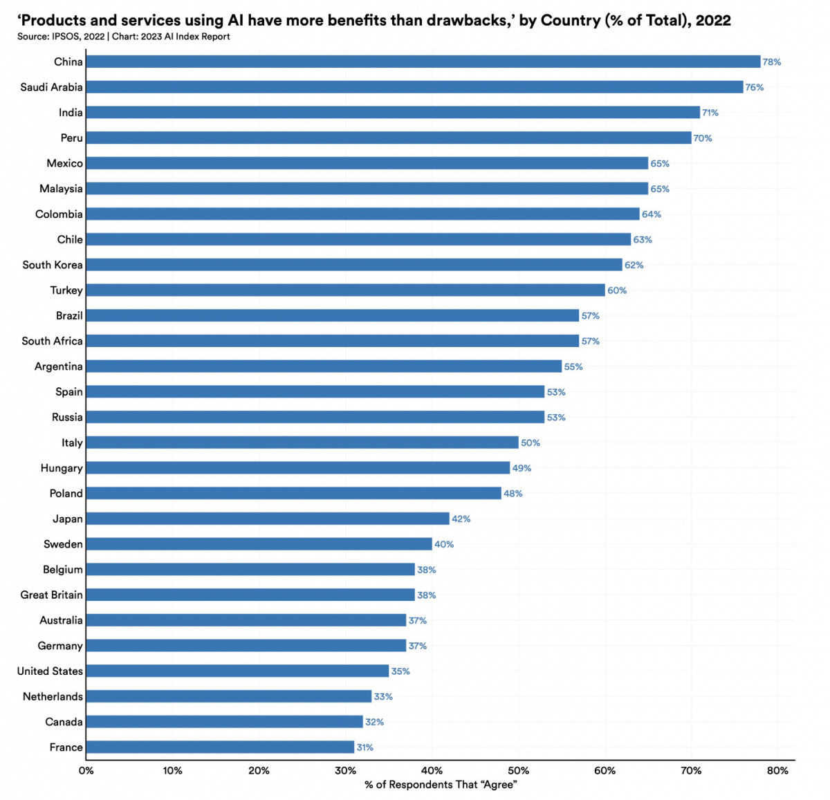 Only 35% of sampled Americans (among the lowest of surveyed countries) agreed that products and services using AI had more benefits than drawbacks, in comparison.