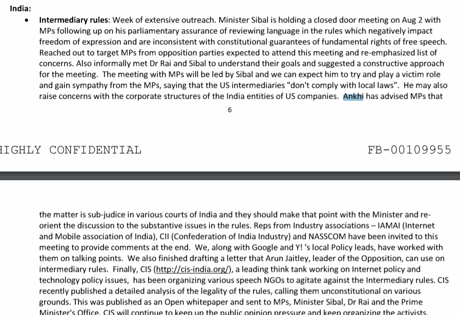 In one instance – in 2011-12, when then IT minister Kapil Sibal was pushing an intermediary rules debate that may have proven inimical to the social media giant's interests – Facebook claims it finished drafting a letter that the late Arun Jaitley (the leader of Opposition) could use, that it informally met "Dr Rai and Sibal" and that it had also reached out to target MPs from Opposition parties and briefed them on the company's list of concerns.