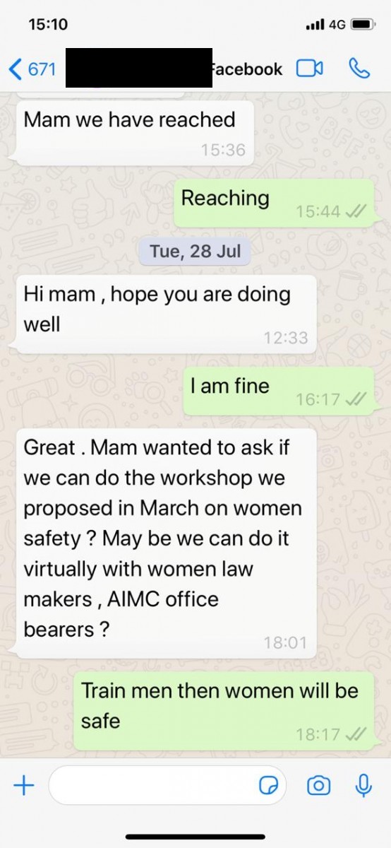 Facebook's official request to a Mahila Congress leader to host a workshop on women's safety.
