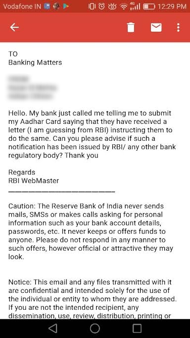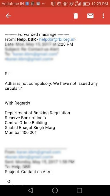 He sent a query on the RBI website, asking whether any notification had been issued to banks, making it mandatory to link accounts with Aadhaar. They felt vindicated by the reply from the RBI’s Department of Banking Regulation: Sir, Adhar is not compulsory. We have not issued any circular.”