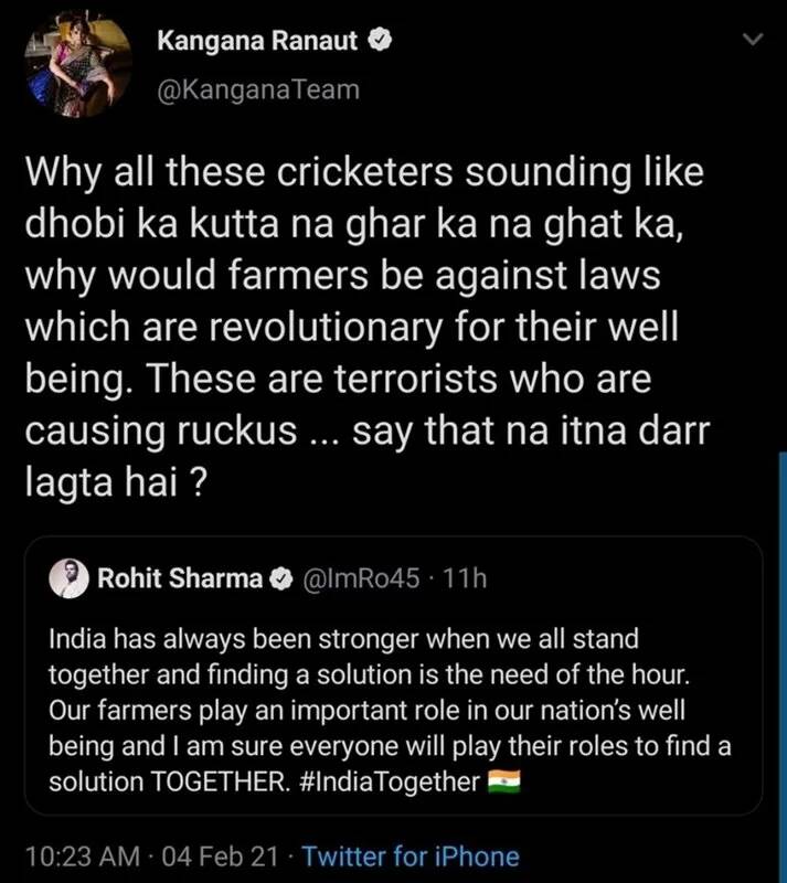 In another tweet, Ranaut called out cricketer Rohit Sharma over alleged non-partisan attitude.