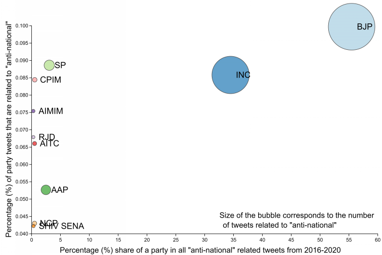 Figure 2: Political parties and their volume of use of “anti-national” between 2016 and 2020.