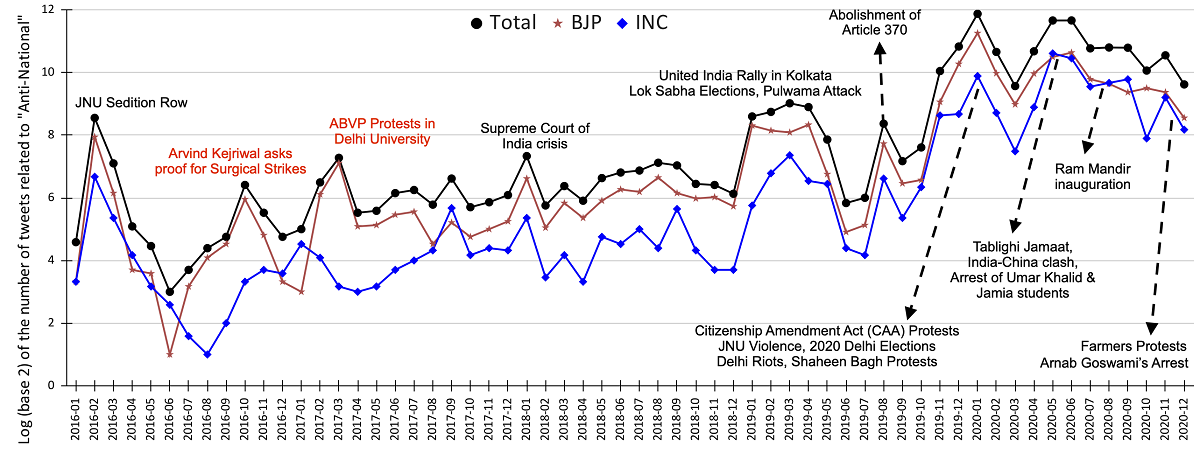 We examined the use of the term 'anti-national' and its various synonyms and derivatives by politicians across parties and states in India between 2016 and 2020 and present the results here. In particular, we used a database of tweets from about 37,000 Indian politicians, public figures, journalists and media houses from the NivaDuck database. We considered the time period from January 1, 2016 to December 17, 2020, and used variants of the term anti-national either in text or as hashtags, using a substring match (anti-national”, “anti national”, “antinational”, “anti_national”).