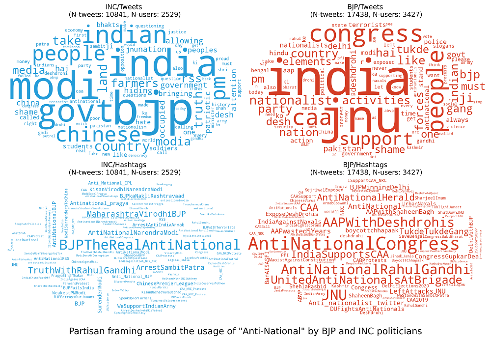 We see in Figure 3, for instance, that while both the BJP and INC attack each other using 'anti-national', the INC focuses on the party, the RSS and a few key leaders including Narendra Modi, Sambit Patra and Amit Shah, or uses terms to target the BJP.