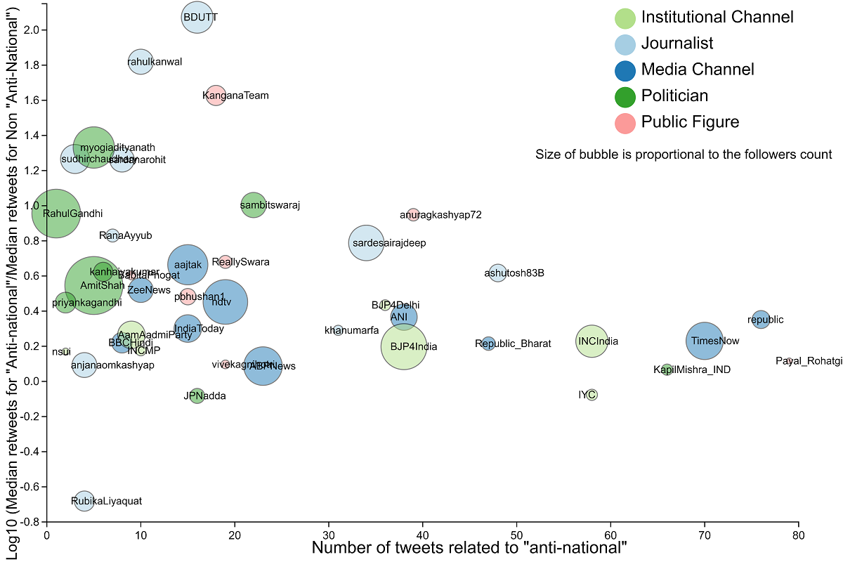 We also see two important patterns here. First, a small number of accounts tweet the terminology out significantly more than most others – @republic, @Payal_Rohatgi, @TimesNow, and while these do see a significant increase in retweets when the subject matter is ‘anti-national’ related (the figure is on a log scale), a few of highly influential accounts including journalists Barkha Dutt and Rahul Kanwal and actors Kangana Ranaut and Anurag Kashyap get much more attention.