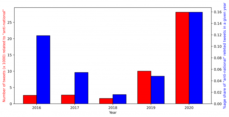 Figure 1: Annual change in number of ‘anti-national’ tweets (red bars) and the annual percentage increase in tweeting about ‘anti-nationals’ (blue bars).