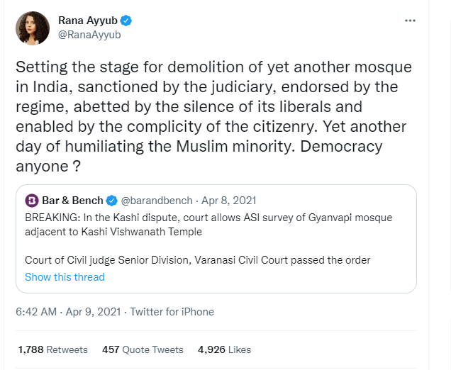 Ayyub's withheld tweet -- dated April 9, 2021, a screenshot of which is shown below -- was a response to a lower court allowing a survey of the Gyanvapi Mosque in Varanasi. The journalist was reacting to the dispute around the mosque, which is adjacent to a temple, and had labelled the court's decision as having set "the stage for demolition of yet another mosque," in reference to the Babri Masjid's demolition in Ayodhya over similar claims.
