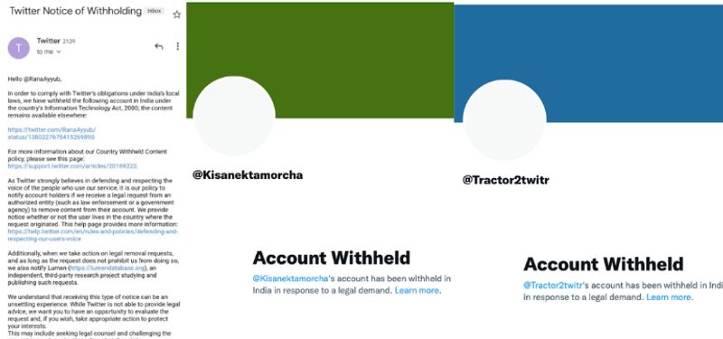 Twitter also appears to have withheld two accounts associated with the yearlong farmers' protests against the now-repealed agricultural laws, @Tractor2twitr and @Kisanektamorcha.