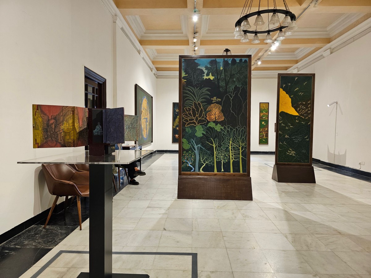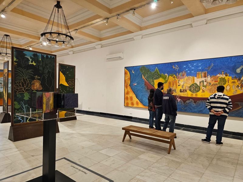 Besides large paintings on canvas, were other works, fashioned like stand-alone screens, with paintings on both sides. Another set of images referenced Kaavads, the folding portable shrines that were carried by traders from Rajasthan in the not too distant past, on their long journeys across vast territories, as they built their networks of exchange. Produced over a five year period with his assistants in his studio in Vadodara, the artworks on view, while visually sensual, also required an art historical unpacking to get to the depths of their meaning.