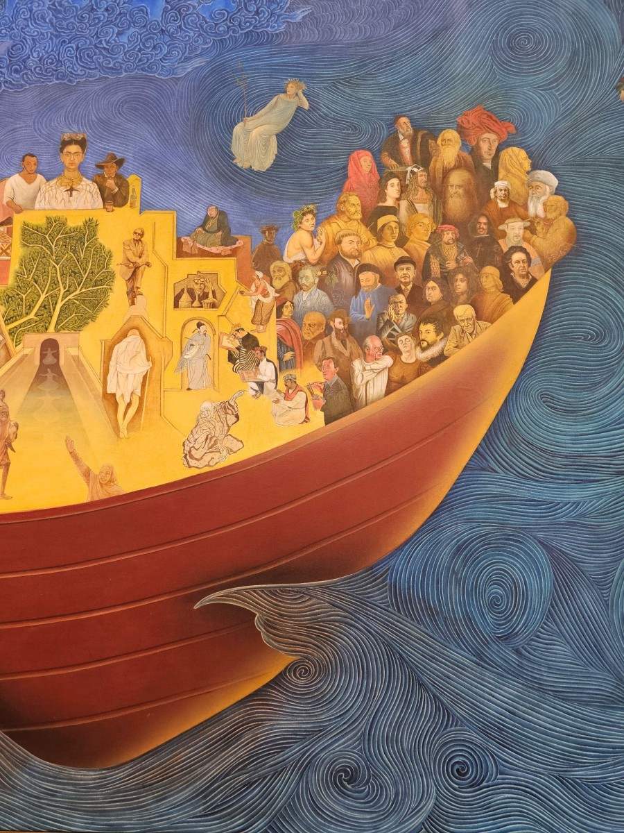 While the exhibition was on in Delhi from February 17 to March 12 – it is now showing at Mumbai’s Chemould Prescott Road gallery till May 15, 2024 – Sheikh agreed to artist and academic Shukla Sawant’s request for an interview. Before the interview commenced, Sheikh and Sawant did a walk through the exhibition, during which he introduced her to the various characters inhabiting his paintings. Other than William Kentridge, the South African artist who practises from Johannesburg, all other figures were of artists philosophers and poets of the past. But there are other figures that feature in his large narrative canvases. Often taken from canonical paintings, given a new context through repositioning, in Sheikh’s paintings they tell different stories. It is an inverted image of the figure of ‘Peace’ from the mural, Allegory of Good and Bad Government, painted by Ambrogio Lorenzetti the Sienese painter in the early 14th century that caught Sawant’s eye. Cupping her ear to listen, waiting patiently, ‘Peace’ in Sheikh’s flipped version appears without her metal armour which features in the original painting by Lorenzetti, lying near her feet and beneath her pillow.