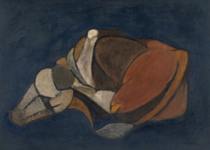 The works display Tyeb’s instantly recognisable themes and images of a rickshaw puller, a bull, a falling figure and a bird that dominate almost all his works. They demonstrate human hardships, conflict, violence and resilience. Often there is an iconic diagonal line to split the theme.
