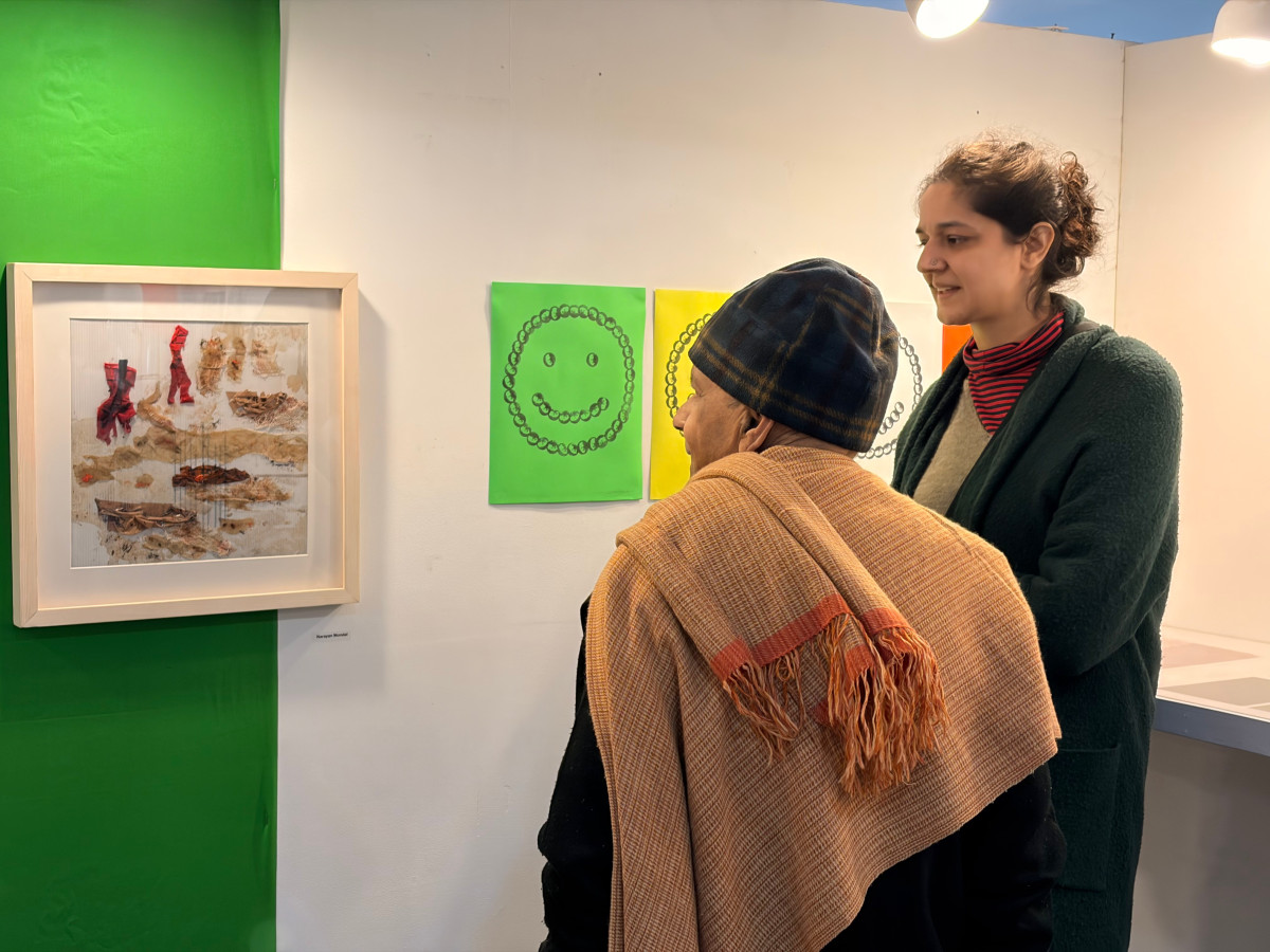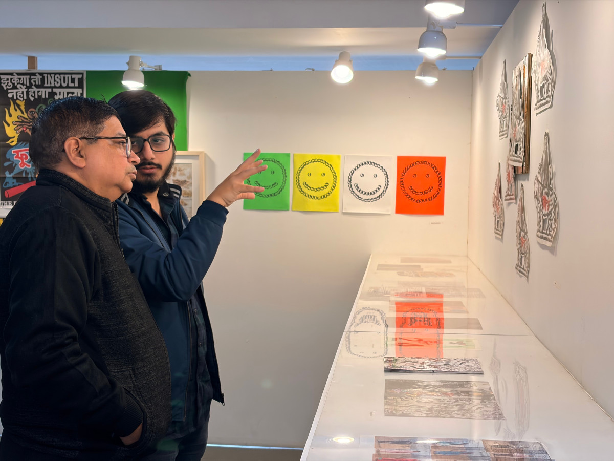 The opening saw a warm and varied gathering, with people across generations engaging closely with the works. Moving through the exhibition, one could spot well-known intellectuals and artists, including Geeta Kapur, as well as Professor V. K. Tripathi, former IIT Delhi professor, who in recent years has become widely known for distributing pamphlets on public issues.