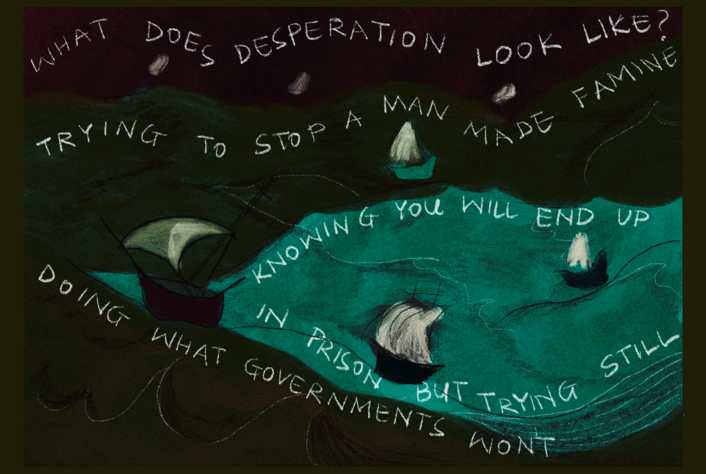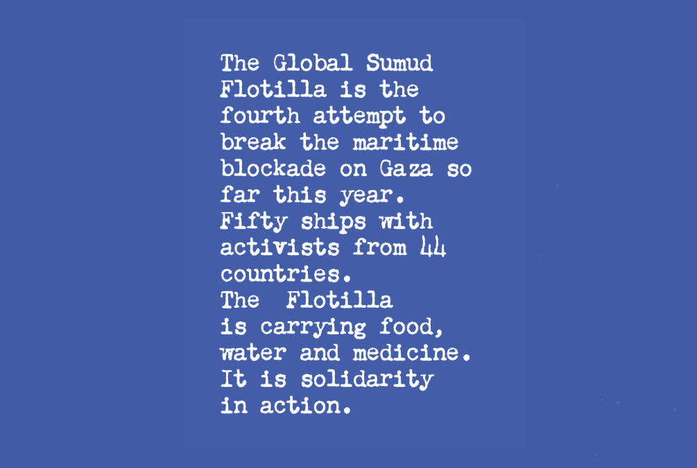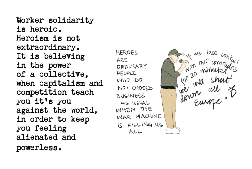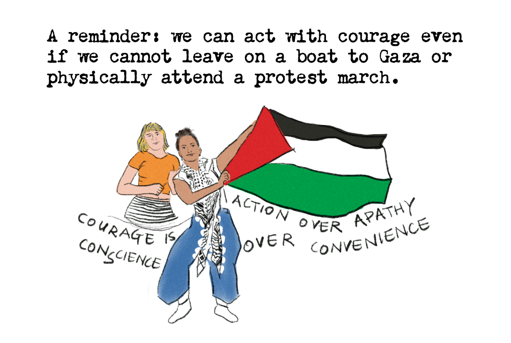 So what does courageous action look like? Reading about the activists and citizens of 44 different countries aboard the Sumud Freedom Flotilla, I’m reminded that heroism is in fact the courage of ordinary people, workers. This week, I cannot stop thinking about the dockworkers of Italy who promised to bring Europe to a standstill if the flotilla comes under attack or loses contact at sea. Despite the national policies and bureaucracy that strives to politicise and stifle workers’ movements, the dockworkers of Genoa have made their position clear for years: “We don’t work for war.” In 2019, these workers blocked a similar shipment for the same Saudi company, after discovering the declared civilian cargo was in fact weaponry.
