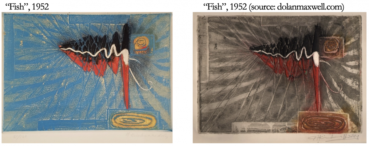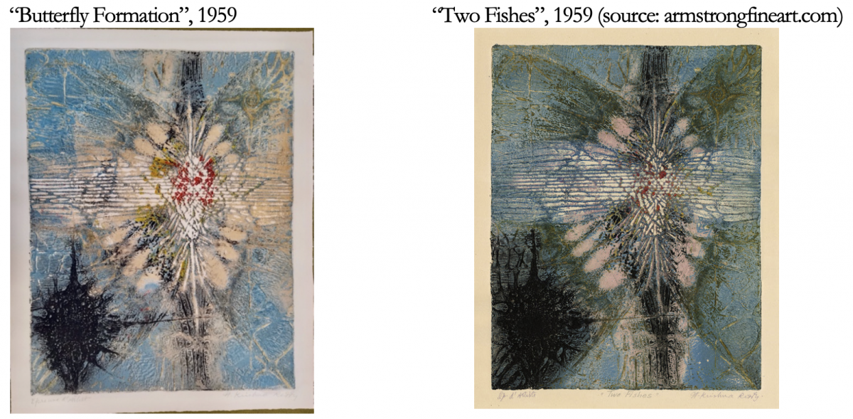 We can easily slip into suggesting that the reason for this difference in naming was contingent on circumstances and that it just happened (as Judy Blum Reddy, his wife, had informed me and I don’t doubt her memory in this regard). The contingency in naming, however, has also to be seen in light of what, I consider, is Reddy’s concern with depicting temporal emergence. Reddy argued that “our mental concepts...cannot adequately probe the recesses of reality” – hence there is always an overflow of meaning that cannot be easily captured by the signifier (such as the title). Interestingly, Reddy not only had more than one title for several of his prints, his titles often switched between a verb and a noun (e.g., “aspiration” and “demonstrators”), which reflect not just semantic shifts, but that between becoming and being. He, for example, titled the same print “butterfly formation” and “two fishes” or would not even title a print, even if it was an artist’s proof (see the accompanying image). Reddy’s titles also show that the subject of his prints may cut across different species.