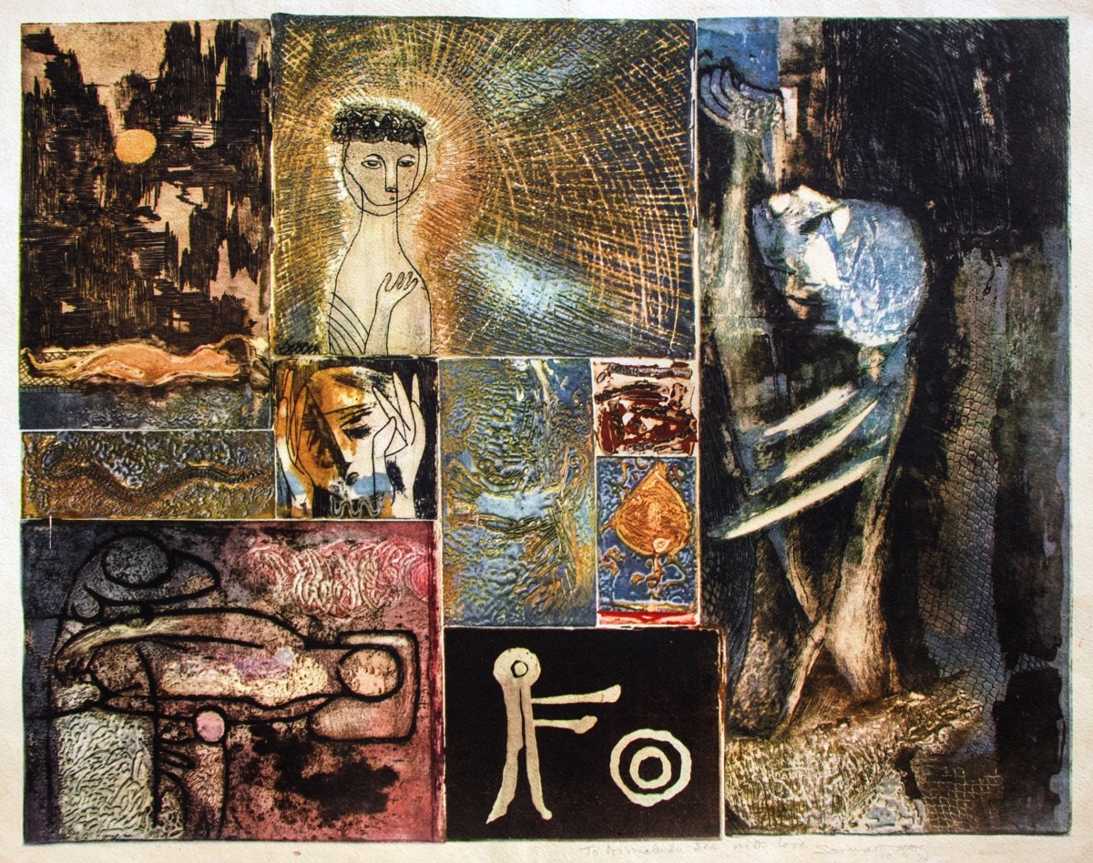 In the 1950s, Hore began exploring the varied world of print-making with curiosity and rigour. In 1958 he took charge of the printmaking department at the Delhi Polytechnic. Now he experimented with etchings, aquatints, intaglios and lithographs. While the art of printmaking was highly advanced in other countries, he did not have too many reference points to lean on around him. He was among the pioneers of this art. Moving on from the political representational figures of his youth, a certain abstraction started appeared in his work now, with his colour intaglios being specially striking.