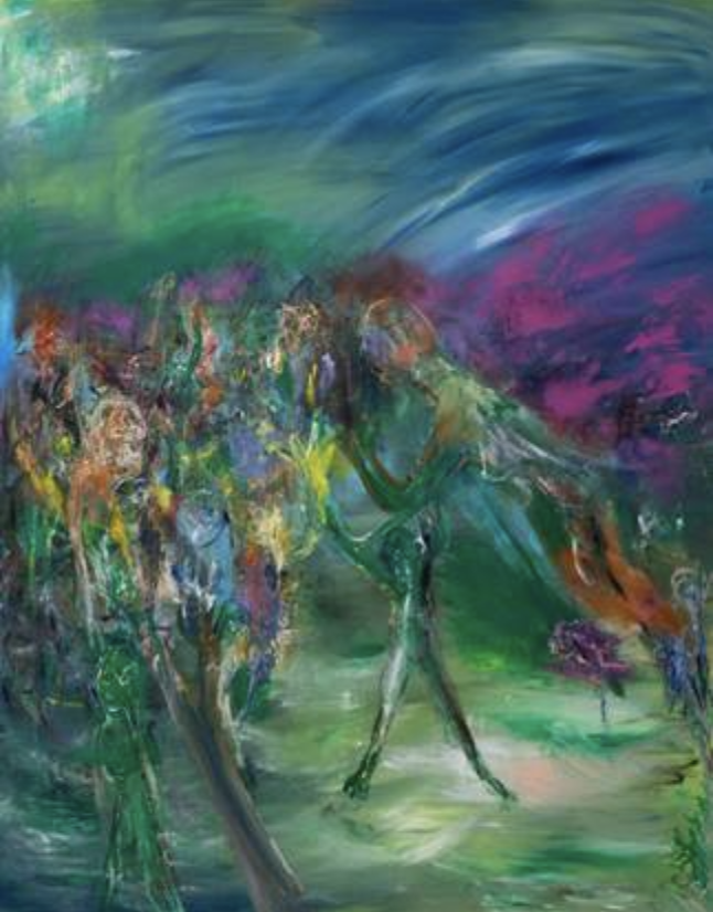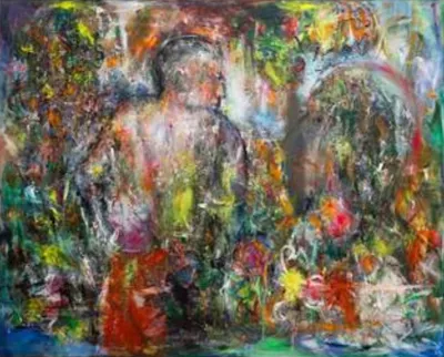 This stage evolves to a state where Dissolution (2025) is composed. The lines fade to merge with space, suggesting interconnectedness and the eradication of separation. Backgrounds and foregrounds in bright combinations of green, blue and purple cannot be ignored. Their forms become a part of the painting, rather than forms becoming the paintings. A subtle merging of figuration and abstraction can be felt through the presentation of bright and soft brush strokes. An unintentional mysticism originates here due to the same reason, giving one the nostalgia of a village scene. The gleaming movement of children, a motherly figure and the aged with a child-like composition of indigenous flowers and trees in between invoke an emotion of joy in the painting.