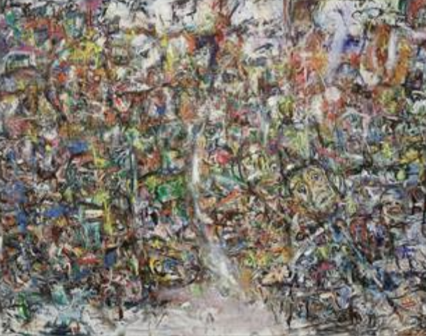 This work shows omnipotent faces with protruding lips and exaggerated expressions. These faces are intertwined meticulously with other living organisms and inanimate creations with prominent black outlines. Colours merely become a part of the clustered faces and white becomes an agent to break the monotony of the web.