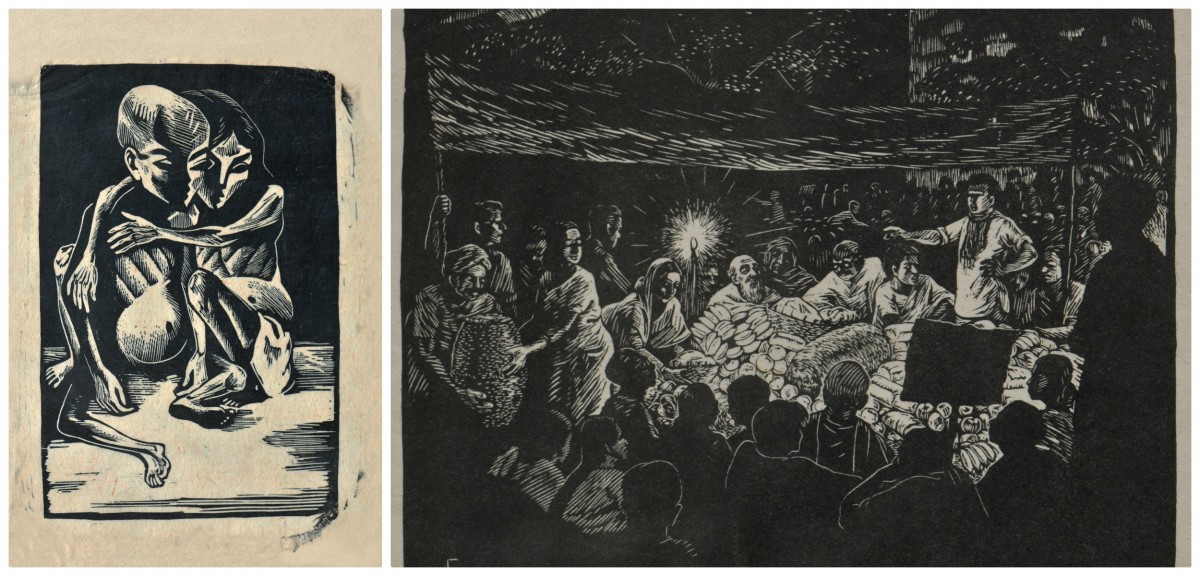 (Left to right) Famine – Calcutta streets, mid-50s, woodcut (Somnath Hore used several of his drawings of the Bengal famine in the 1940s for woodcuts later); meeting at a market, early-50s, woodcut. Photos (left to right): Courtesy of Seagull Foundation for the Arts, R. Sivakumar.