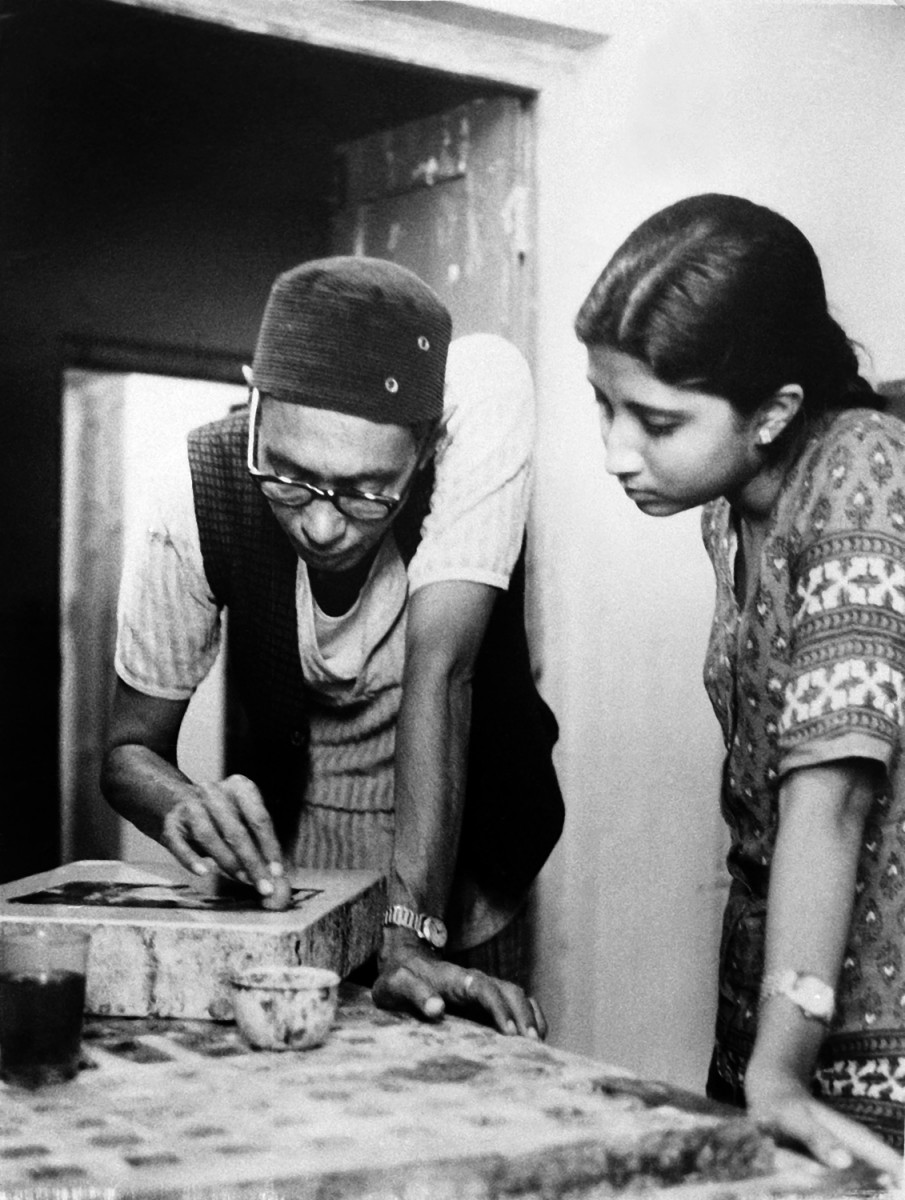 Somnath Hore with a student, Mimi Radhakrishnan, in Santiniketan, 1977. Photo: Suman Dutta