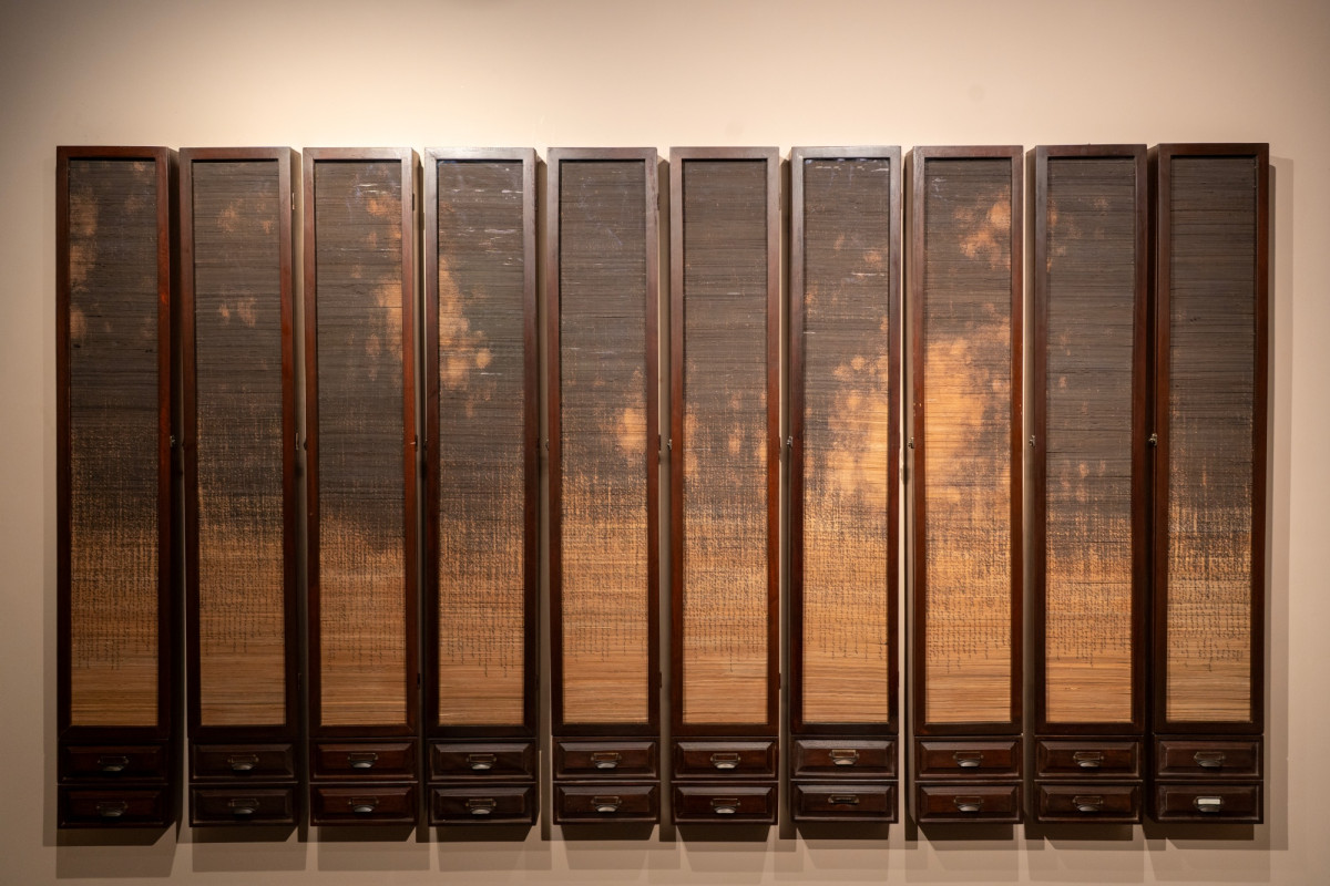Mukherjee fell in love with Ghalib in his formative years, and would frequently visit the poet’s home after his relocation to Delhi. His immersion in ghazals – both as text and performance – over the decades, has made him revisit earlier favourites like Dil-e nādān; and in his evolved interpretation of the verses of this ghazal, the canopy of the sky is not a universal dome over all humanity – rather, each individual has his own sky, his own sense of the vast unknown and his connection with it. That’s a delicate asset that is perhaps more accessible than one’s claim to land, but needs to be protected nevertheless. The little drawers in the installation protect that sky. And its clouds, full of memories.