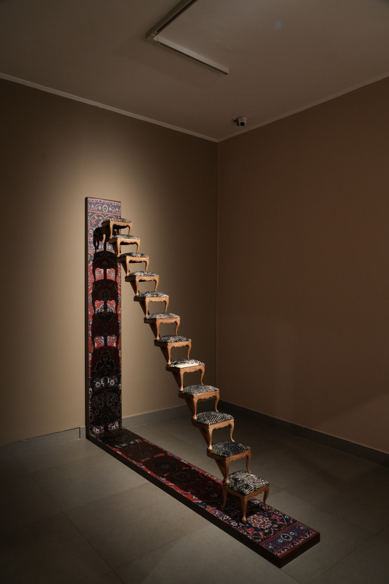 Politics is the beating heart of Delhi. It’s here that national governments rise and fall, and political careers are nurtured. On his arrival in the city, Mukherjee found the politics practised in the city too loud, performative and unavoidable. ‘Continuous Climb’ – with an ascending order of chairs, their upholstery bearing thumbprints as markers of identity, placed as a ladder on a L-shaped cropped and framed carpet – symbolise the vaulting ambition of those who thirst for power, and the costs with which they come. It also conveys the innate desire of many for the power, prestige and social status that a position of authority in any profession can bring.